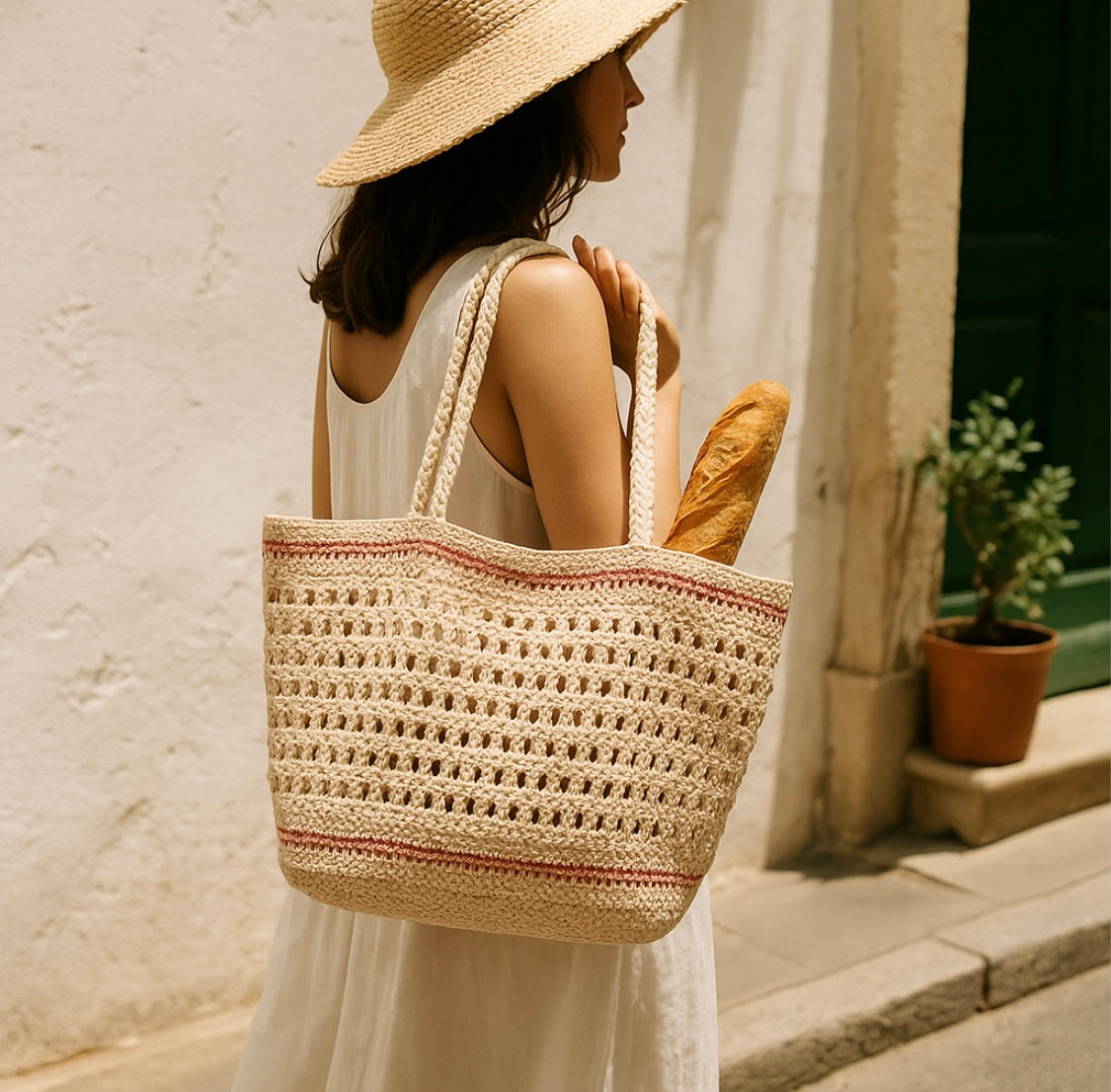 Stella is delicately hand-crocheted from natural Raffia with both closed and open weave throughout. She's an open-top style bag with an incredibly roomy inside.The design features a line accents in different colour that accentuates the shape of the bag and gives its own personality.